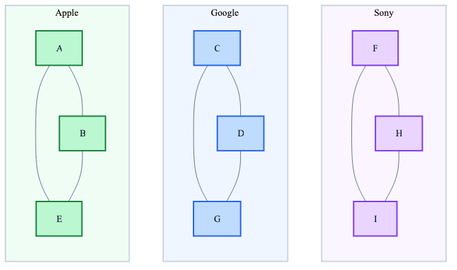 In the diagram below, all three brands sell similar products (earbuds, headphones, etc.), so their nodes are interleaved in embedding space. That’s why the main graph also has similarity edges across brands including direct Apple <-> Google links.