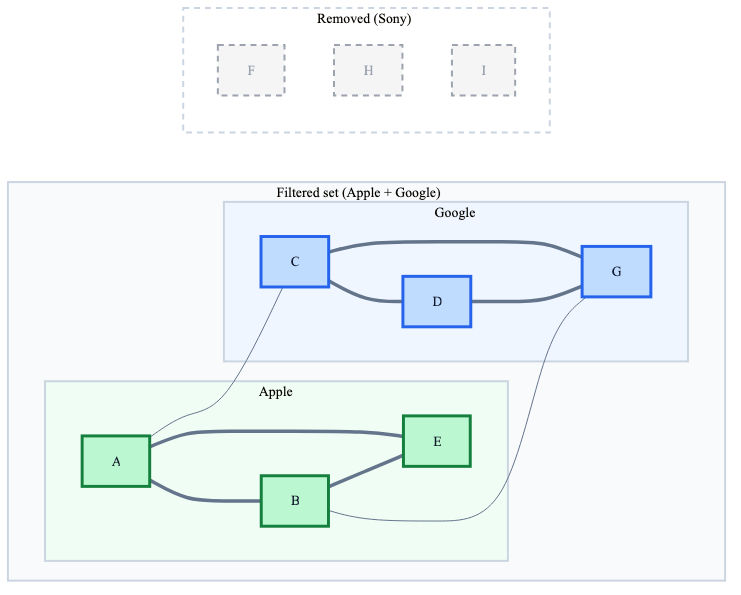 After filtering with brand IN ('Apple', 'Google'), Sony points are removed. Brand subgraph edges keep each brand internally connected. But what about the connection between Apple and Google?
