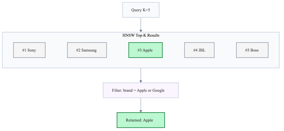 HNSW returned 5 results but only 1 matched the filter. Meanwhile, closer Apple/Google earbuds ranked beyond top K were never retrieved, so they could not be returned.
