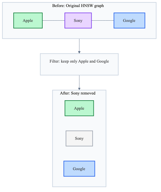 The reason it fails is that the HNSW graph was built on all data. When you filter your dataset, you’re removing nodes from the graph, so many edges disappear. Paths between matching items often route through non-matching ones, and once those bridge nodes are gone, the graph falls apart.